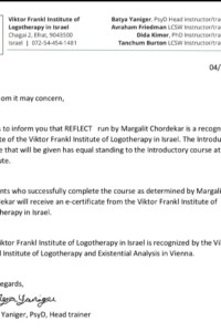 She founded the VFIL – Israel in 2011 which is registered with the Viktor Frankl Institute of Logotherapy & Exixtential Analysis Vienna. The VFIL- Israel has trained over 100 students over the past 13 years.
